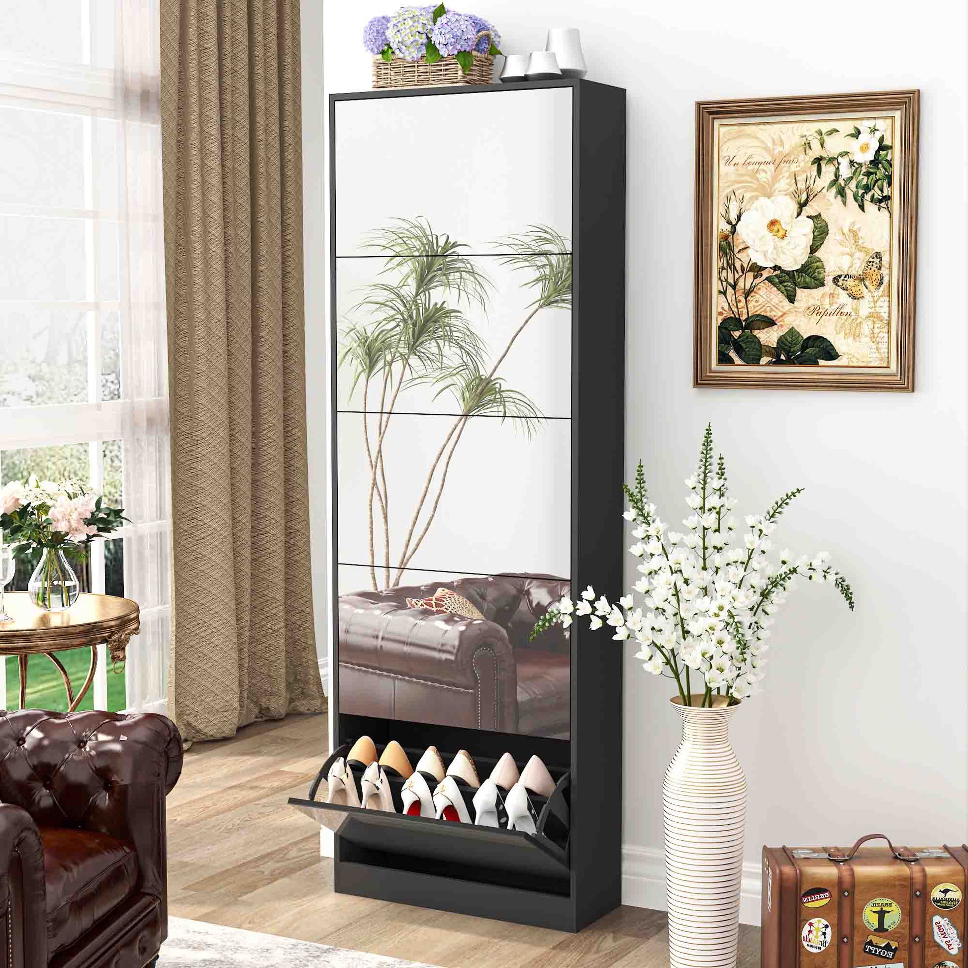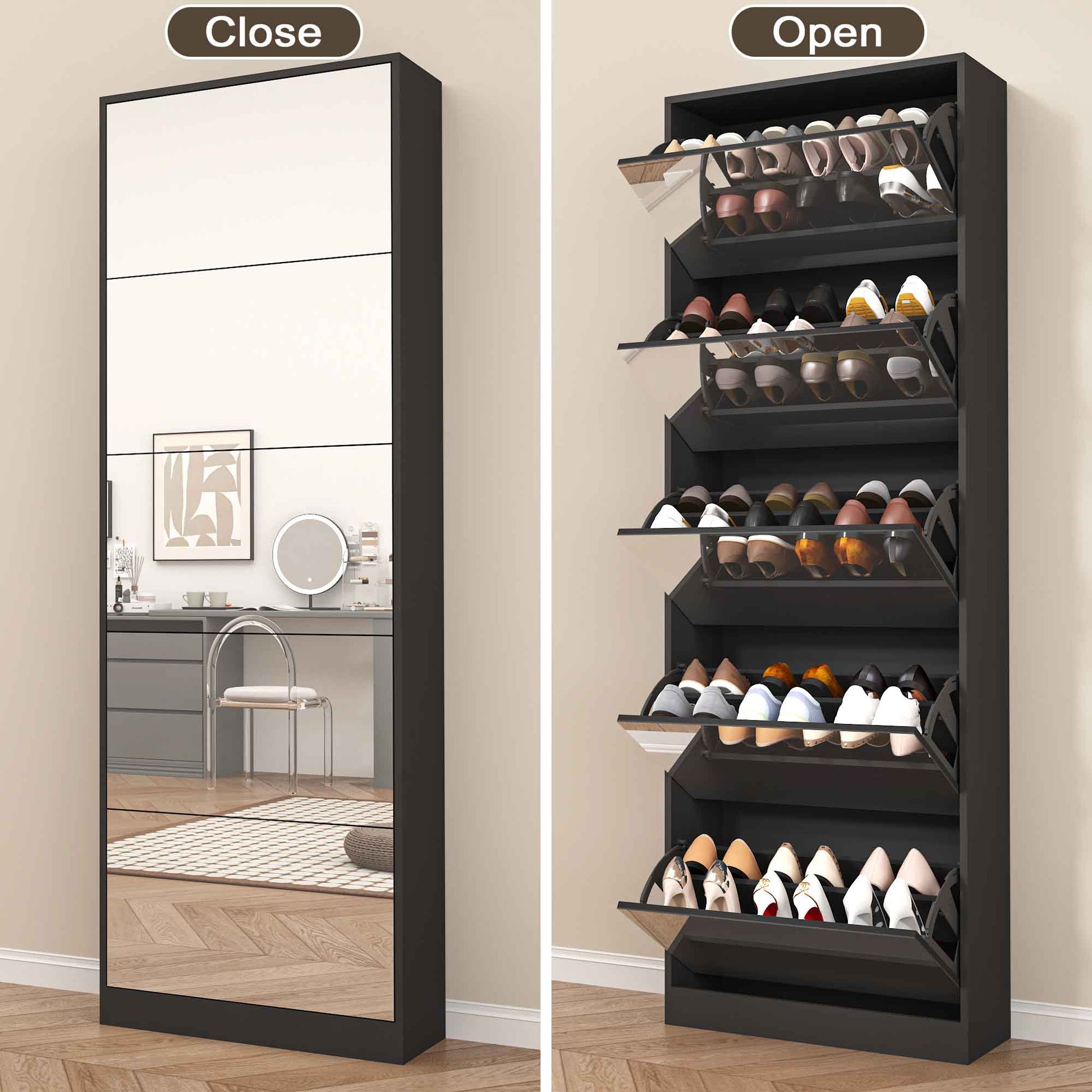 Shoe Storage Cabinet With Full Length Mirror,Wooden Freestanding Shoe Rack Organizer With 5 Tiers Flip Drawers & 30 Pair, Tall Narrow Shoe Cabinet For Entryway, Hallway, Bedroom, Closet, Living Room (Black)